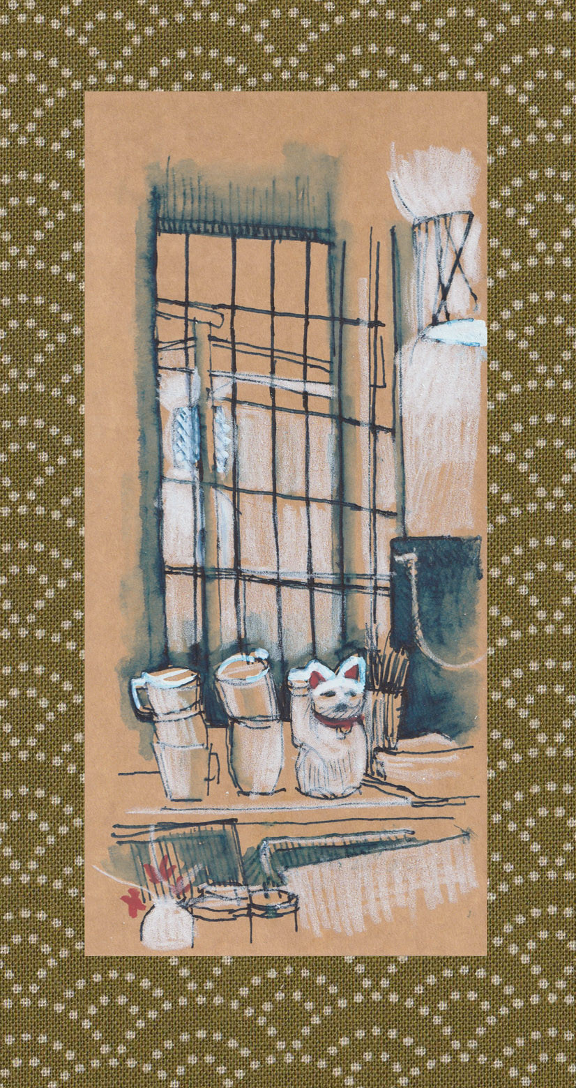 Fountain pen and Posca pen on ‘noodle-box’ card – 10cm x 21cm – in situ.